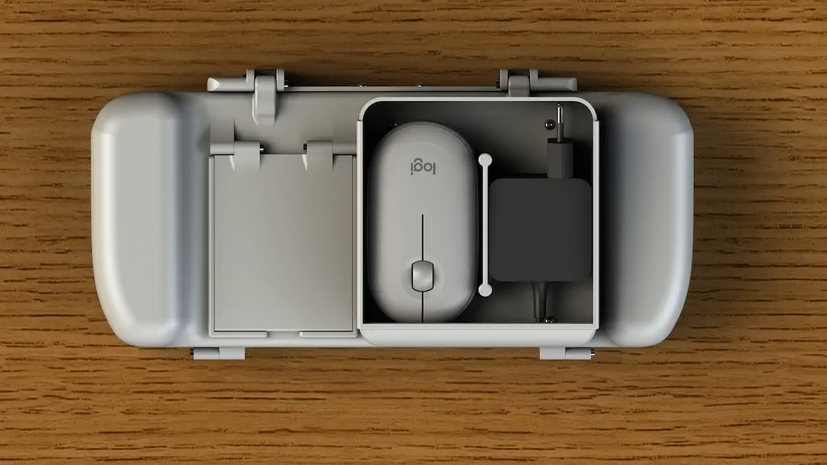 Additionally, two more files allow you to print a handle and a "backpack" to carry a mouse and a charger.