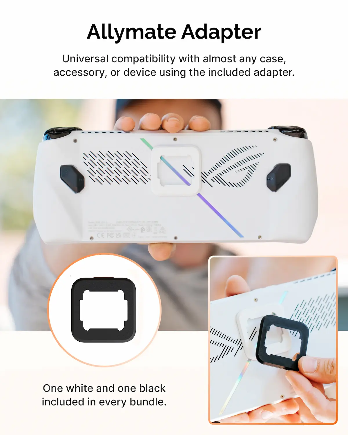 The Allymate follows the same principles as the Deckmate. Thanks to a universal adapter that will be available in black and white, you can mount several peripherals to the back of your handheld.