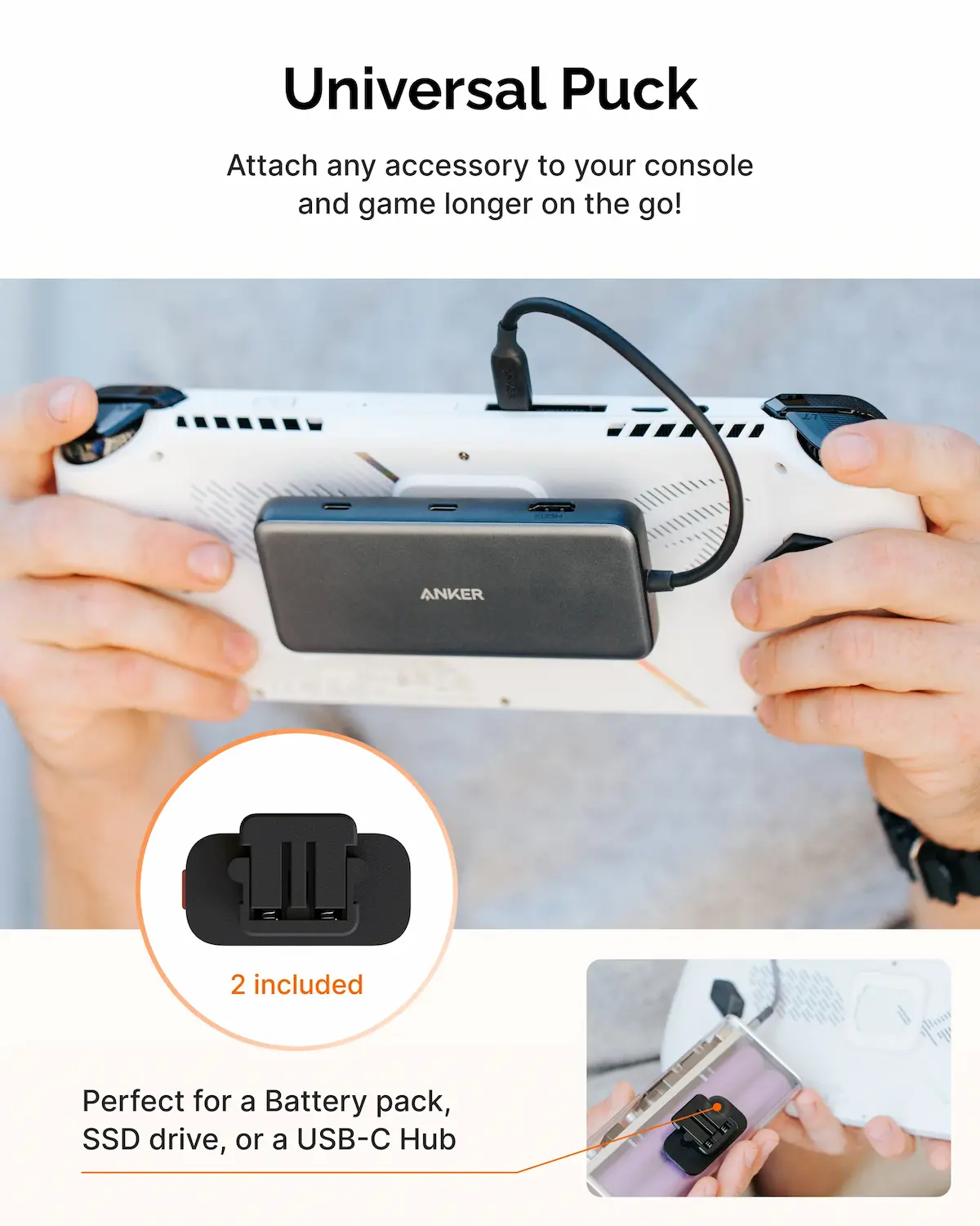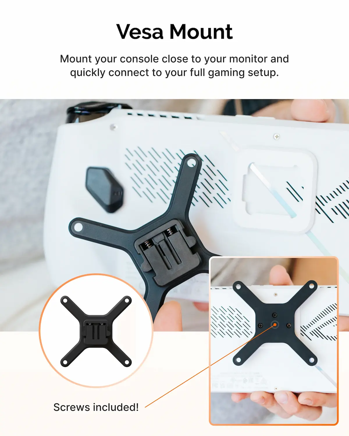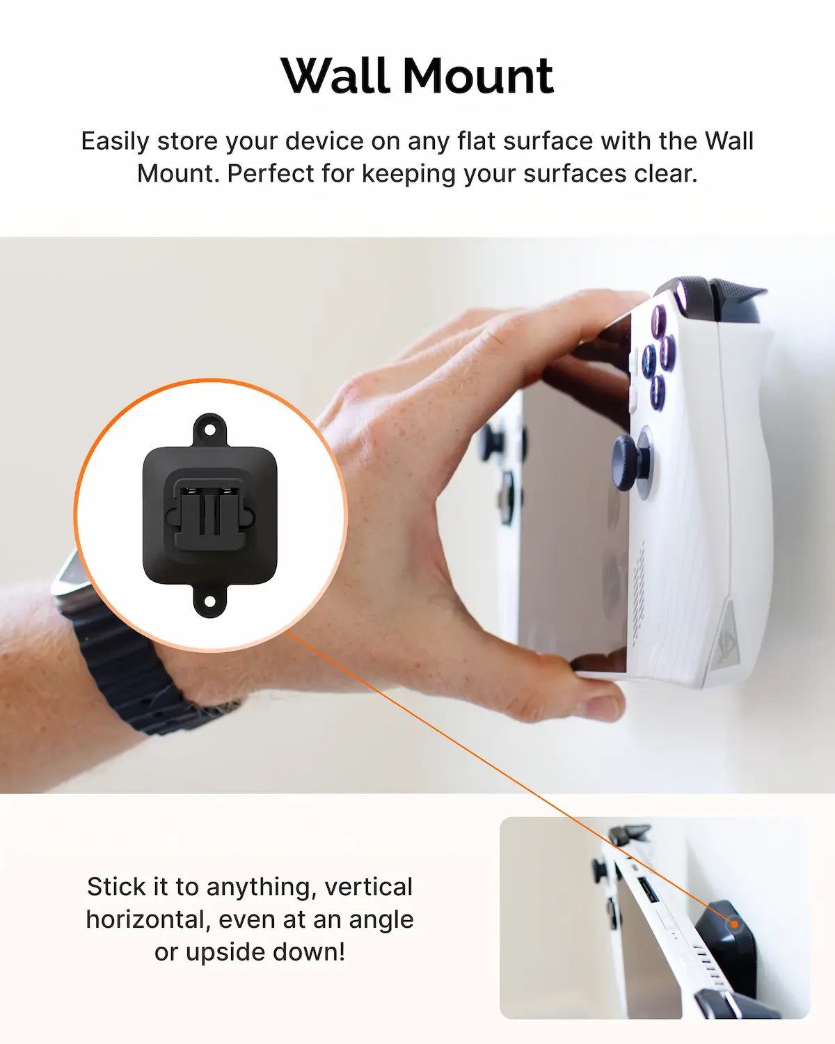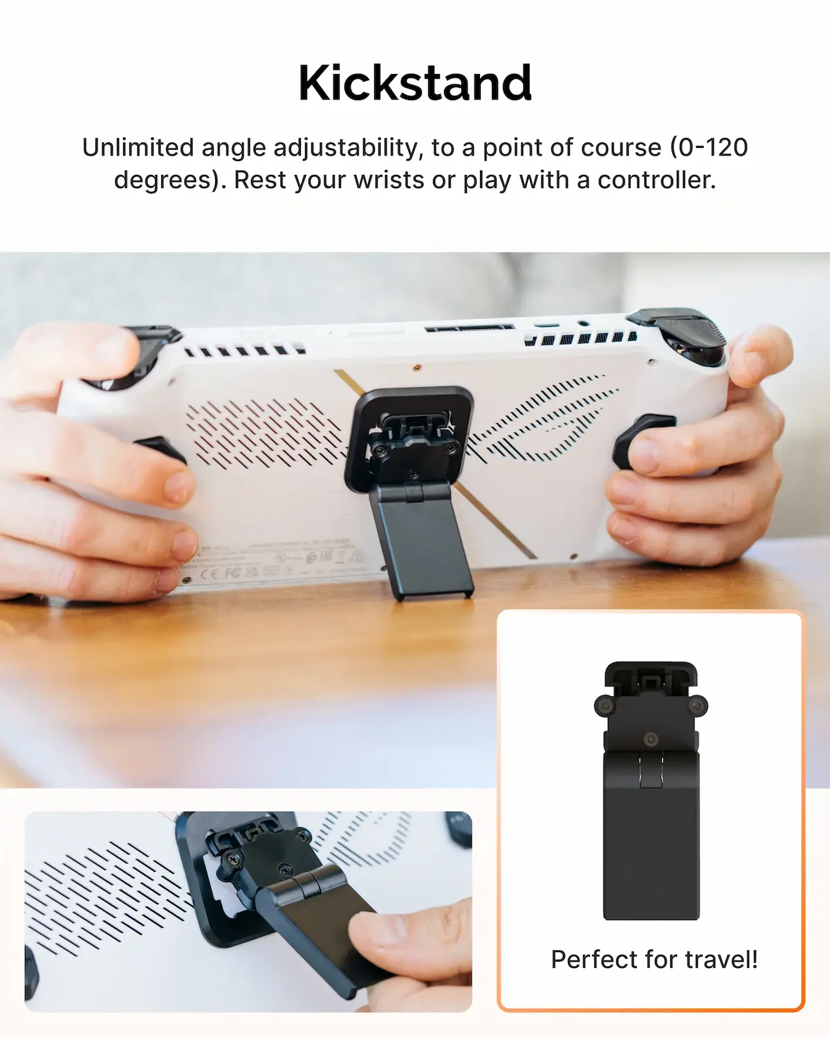 You can either attach a Kickstand, a universal pluck (there are two in the box) that can be glued to accessories like a USB-C hub or a battery pack, a wall mount if you want to transform your handheld into a 7-inch wall-mounted TV, or a VESA mount to attach your handheld to a monitor arm.