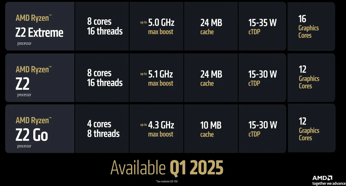 AMD dropped more details on their new handheld APUs. The Z2 Extreme mixes three Zen 5 and five Zen 5c CPU cores with RDNA 3.5 graphics, packs 16 GPU cores (up from 12), and can boost 5 watts higher (nice!). The Z2 is basically just a Z1 Extreme with a new name — same GPU cores, same RDNA 3, and (probably) the same CPU cores (ok!). Then there’s the Z2 Go, which has fewer CPU cores than the regular Z1, runs on RDNA 2 (same as the Steam Deck), but at least comes with 12 GPU cores — way more than the Z1’s 4 or the Deck’s 3 (weird!).