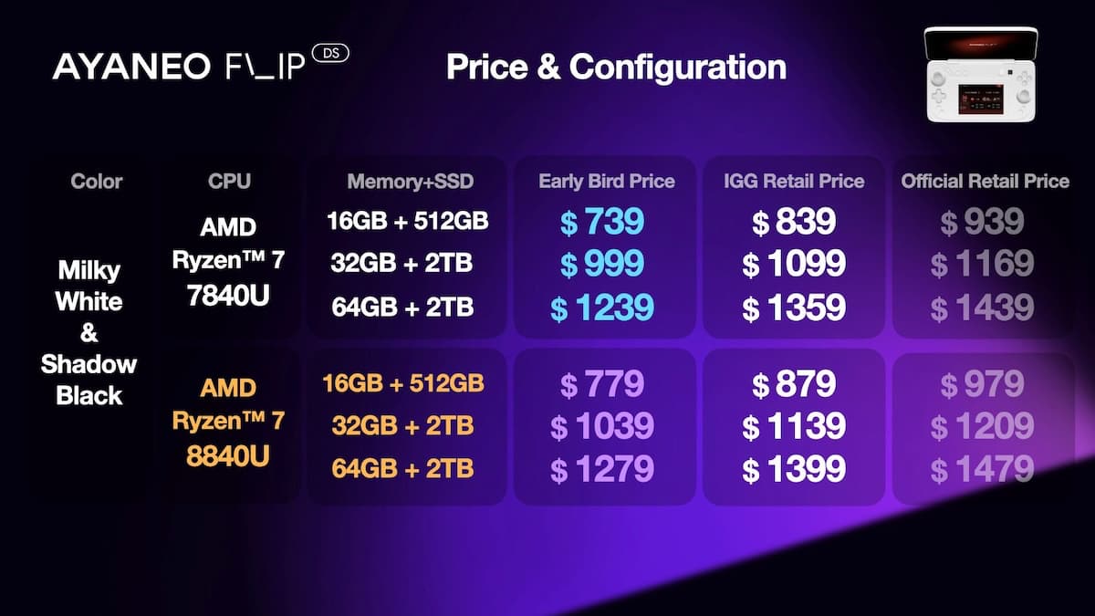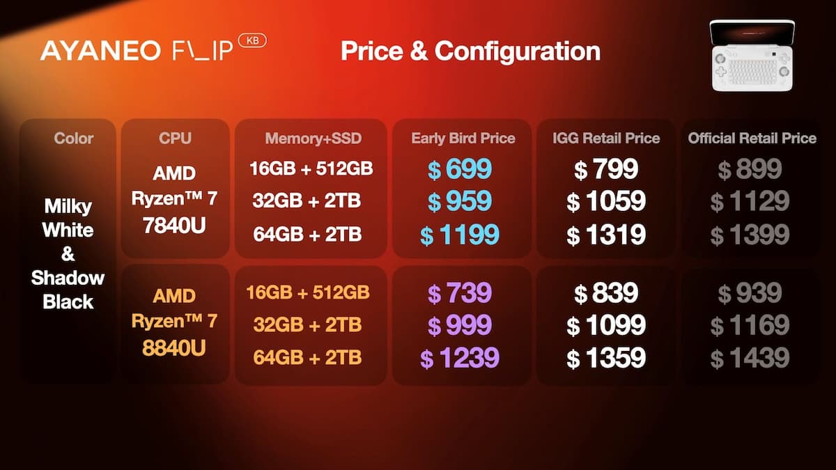 The crowdfunding page has the AYANEO Flip range starting at $699. That's for the keyboard-based model. The dual-screen device starts at an 'early-bird' price point of $739.