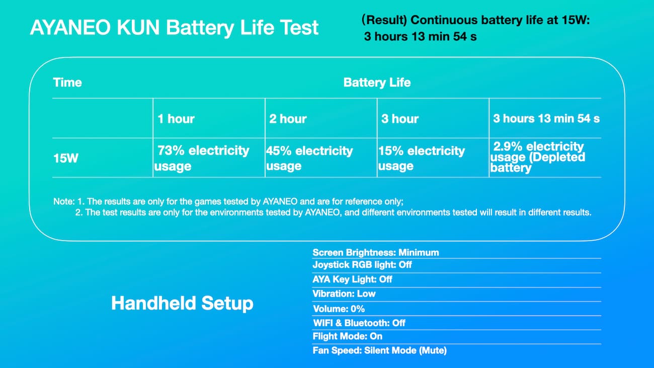 And while that power usually comes at the cost of battery life, the KUN can count on a 75Wh (19500mAh) battery. In AYANEO's internal testing, setting the KUN's TDP to 15 watts will net you over three hours of battery life, but unfortunately, we don't know how long that battery will last at 54 watts. However, we think you need to connect the KUN to an outlet to reach that TDP.