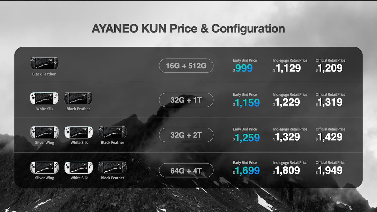 Preorders will start on September 5th on the Indiegogo page, and AYANEO KUN will begin at an early bird price of $999 for 16GB of memory and 512 GB of space. The official retail price for this configuration will be $1209.