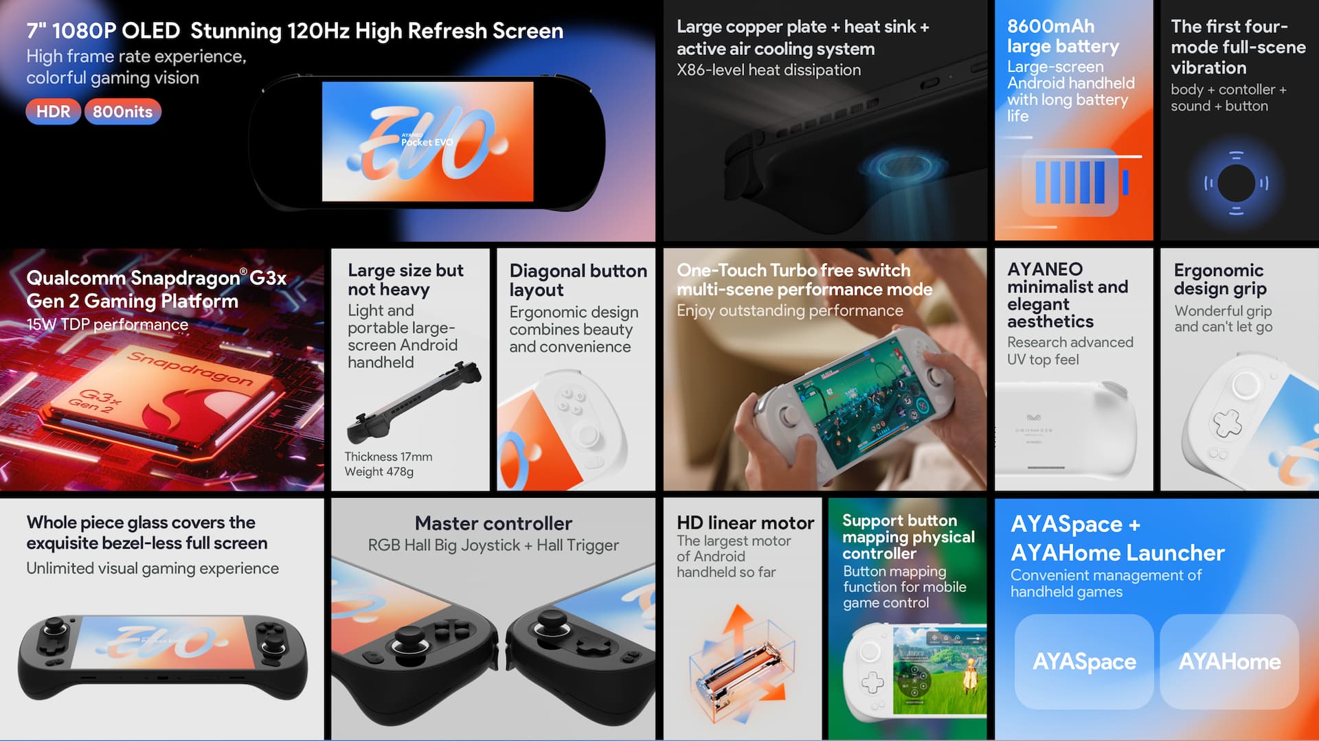 AYANEO's Pocket EVO borrows its design from the AYANEO 2s, but runs on Android, and has a 1080p 120Hz OLED Screen.