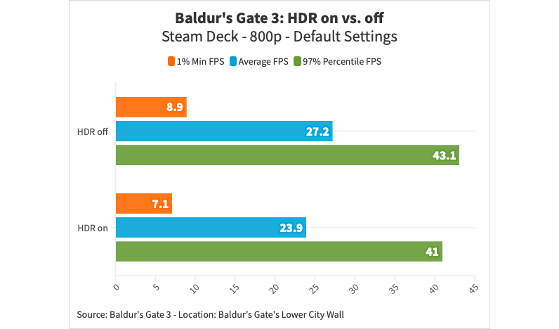 There's some likelihood that you may be using an OLED Steam Deck by now, which brings us to an important point right off the bat: enabling High Dynamic Range (HDR) in Baldur's Gate 3 significantly impacts performance.