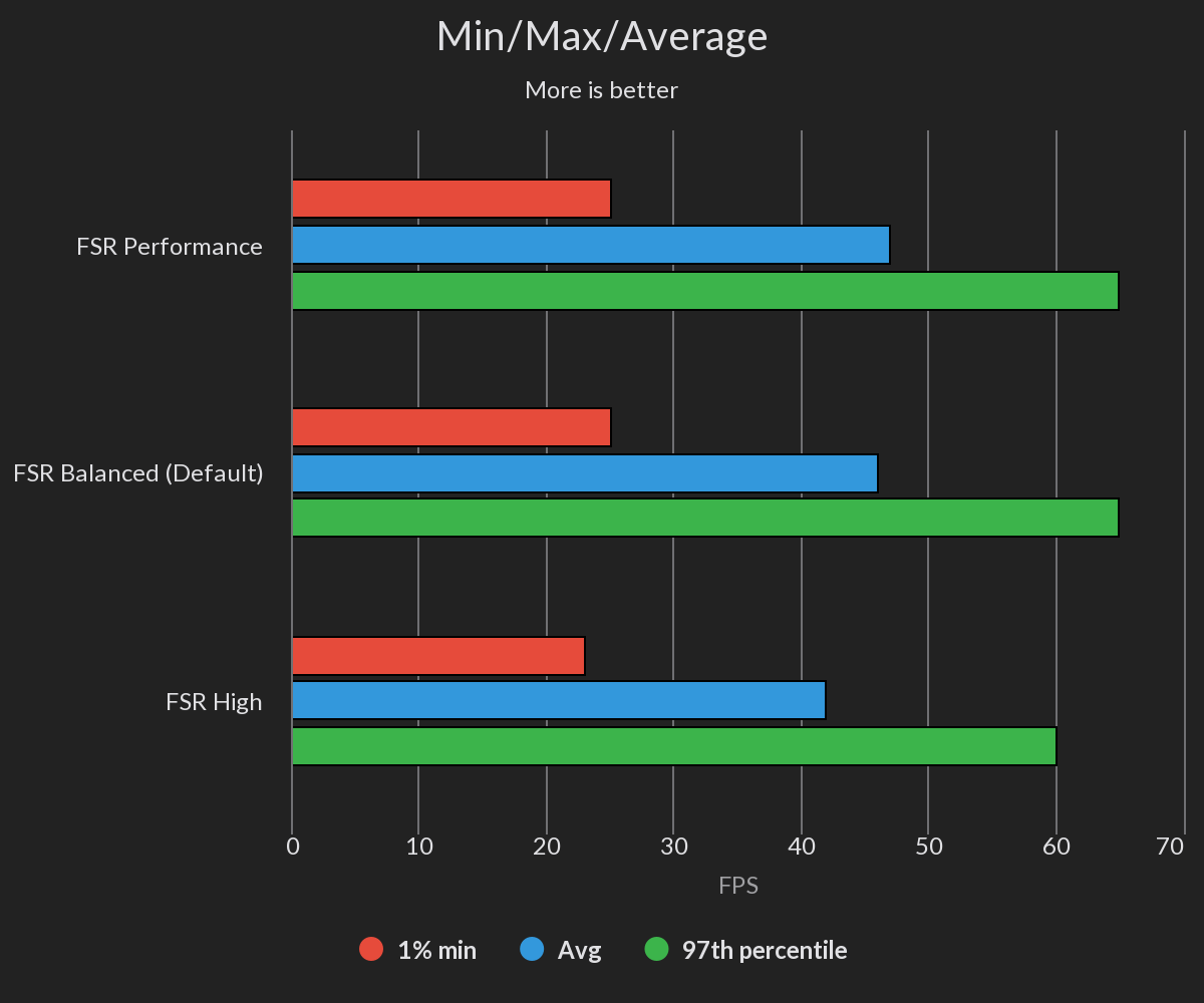 However, even with FSR1 incorporated and all of its presets compared against each other, there’s no way to circumvent regular dips below 30FPS. Regardless of which FSR setting you try, the result will always be a blurry mess that doesn't do justice to the visual brilliance of the game.