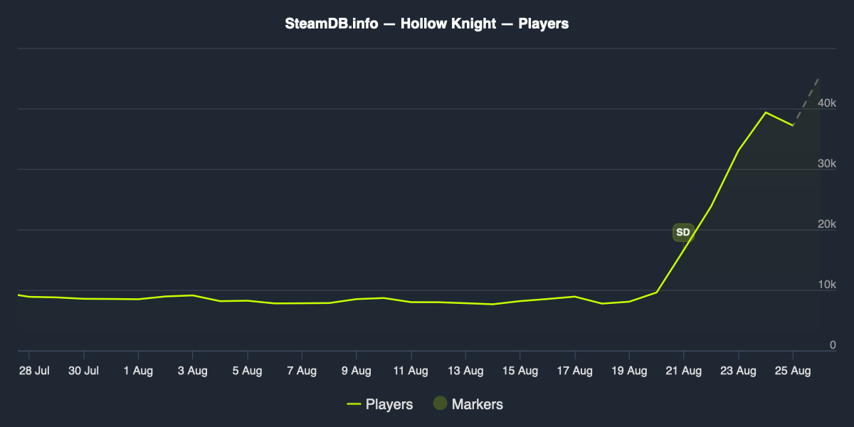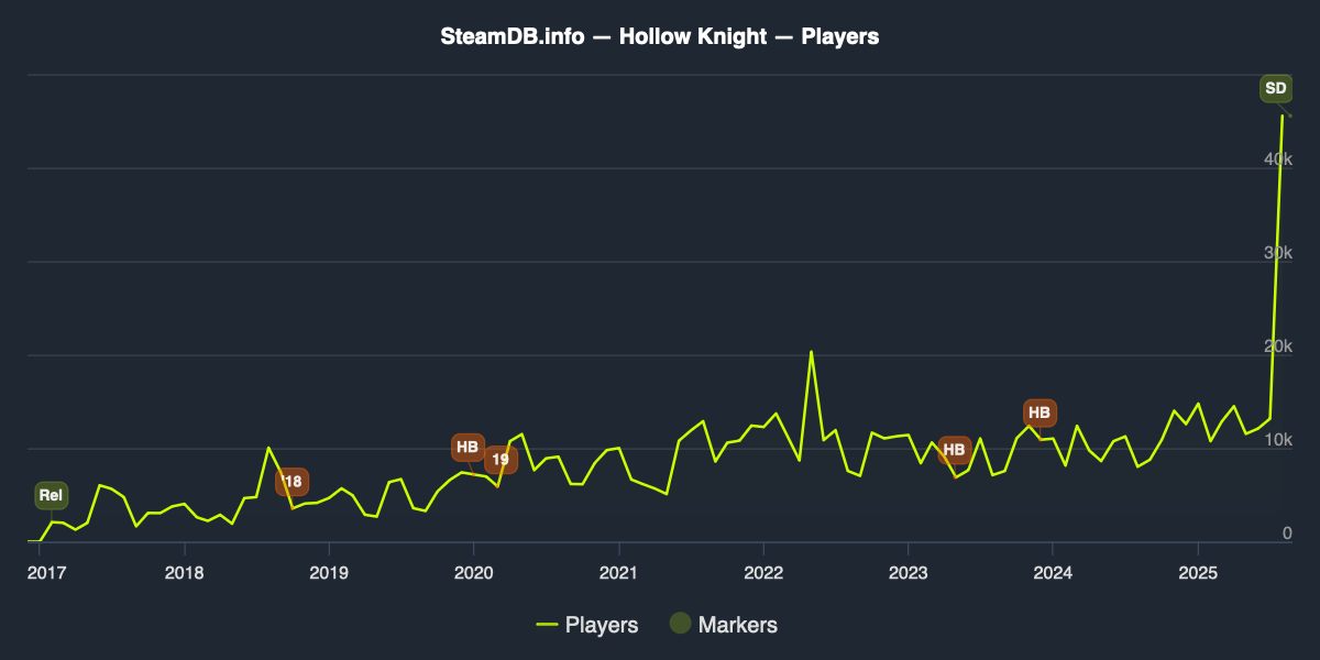 Prior to this week, the game had only ever seen roughly 20,000 concurrent players on Steam. However, after the launch date reveal for Hollow Knight: Silksong, this rose sharply to the high we now see today.