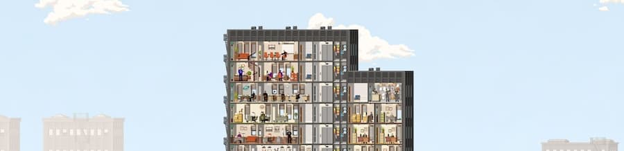The 2D game lets you build a huge sky rise, complete with a mix of tenants, all with their own needs.