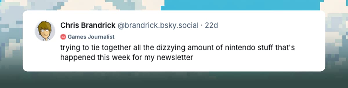 "With the continued and accelerating downhill slide of Twitter as a platform for game devs, I think we need a new home where we can meet, share, and support each other. My hope is that I can play some small role in making Bluesky that place."