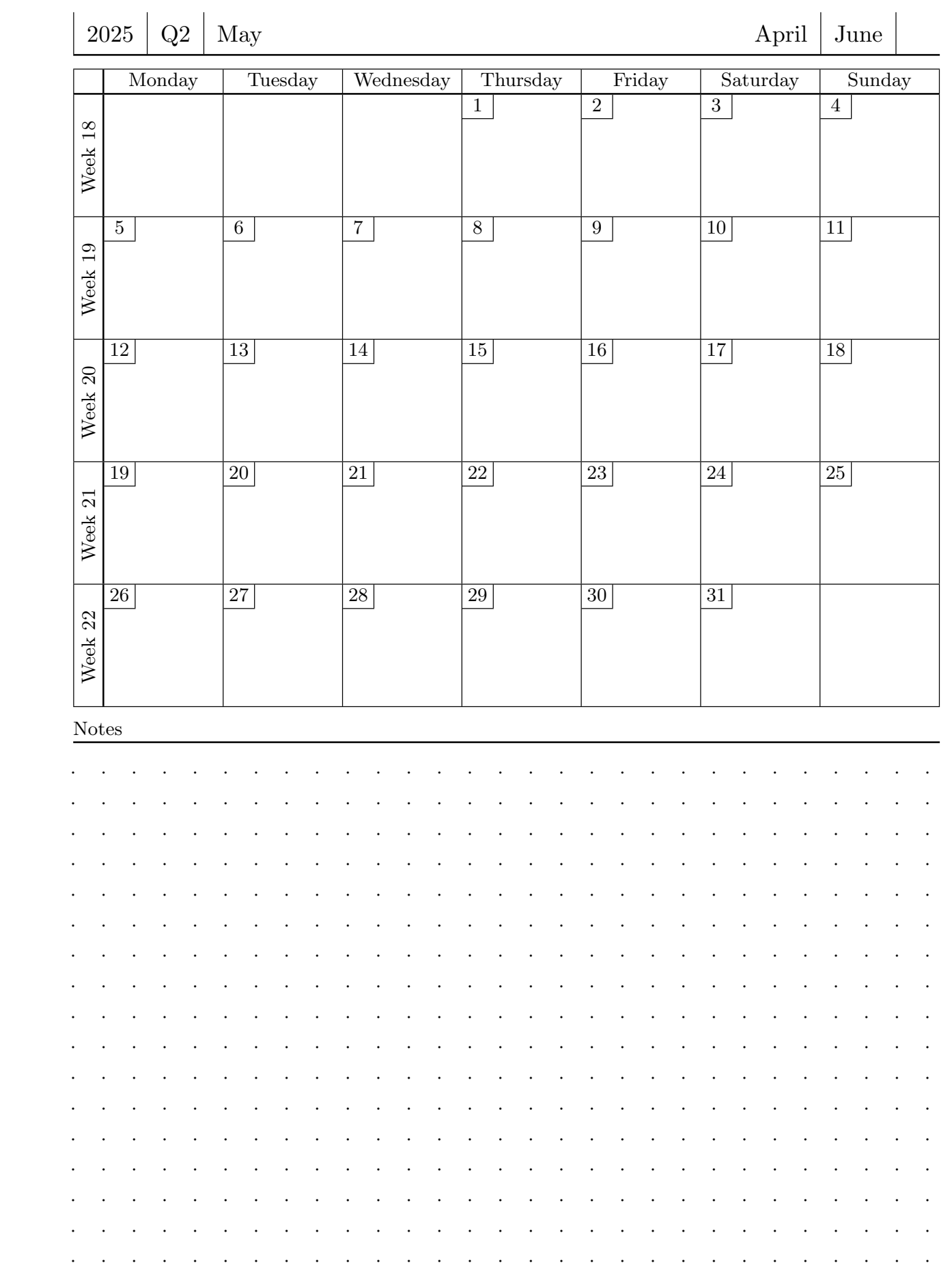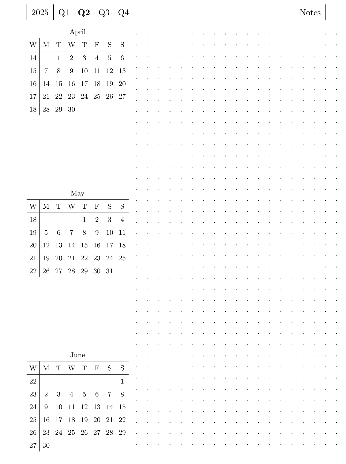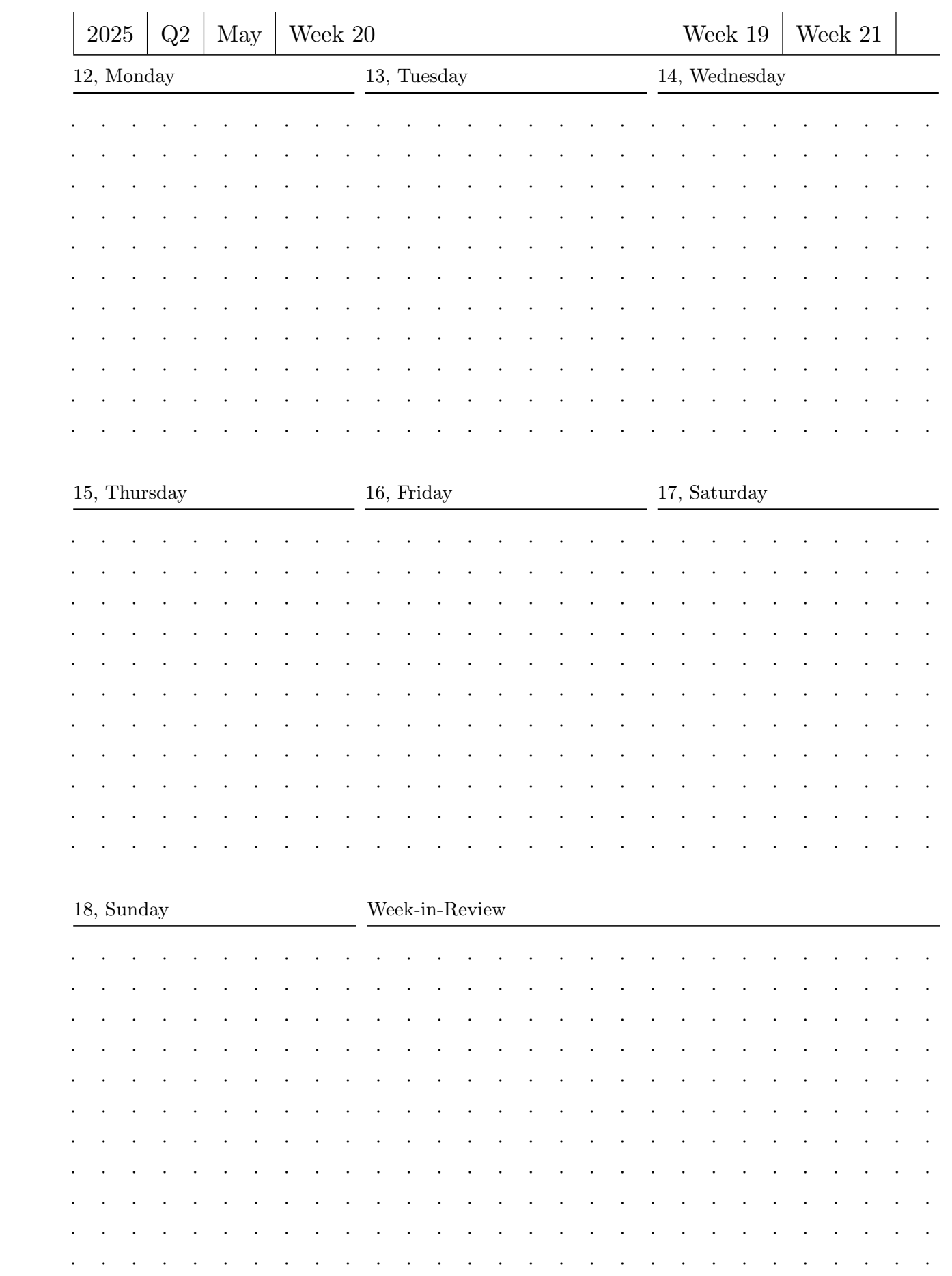 This journal is built off the excellent latex-yearly-planner by Vitaliy Kudryk, but modified for my own needs: