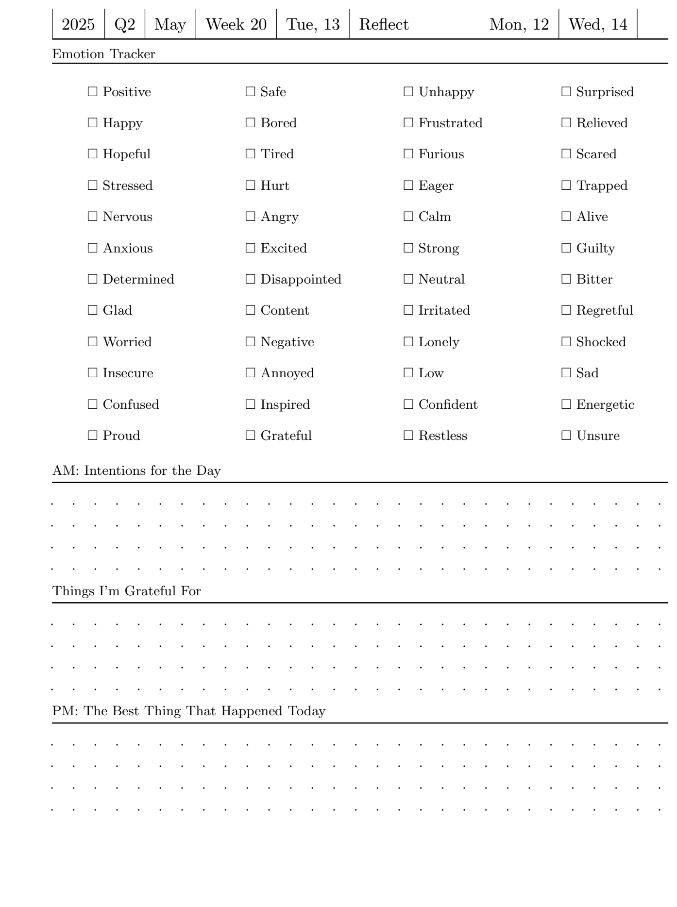 - A “Reflection” page with a mood tracker, space for daily highlights, and a gratitude box