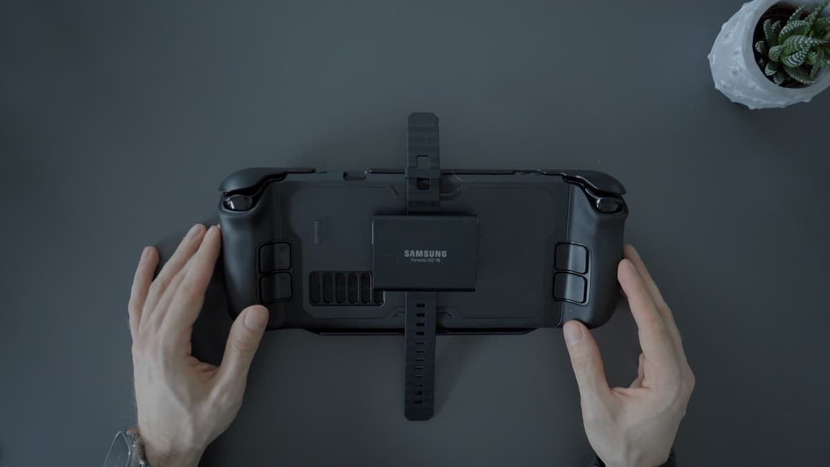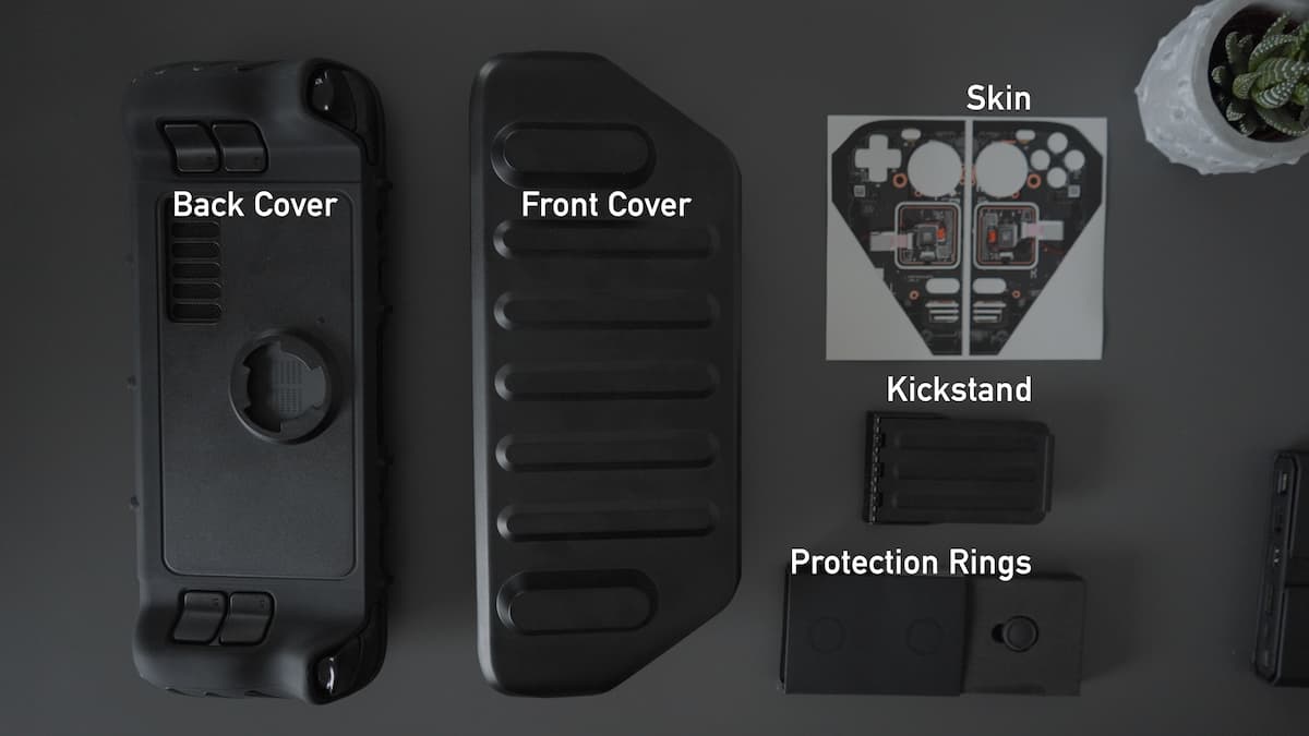 Every order comes with a protective front and back cover, a kickstand, an adapter for the official Steam Deck dock, and a loop (see image) to attach additional third-party accessories to the back — like my Samsung T5 or my Anker 737.