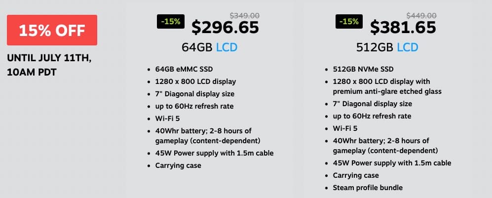The 15 percent discount is available now until July 11th — meaning you have just over two weeks to snag the handheld at a roughly fifty dollar discount. This $297 model is the 64GB configuration. If you want to spend a bit more you can get the 512GB version of the Steam Deck for around $382. It's worth noting that the 512GB model also features the antiglare etched glass covering.