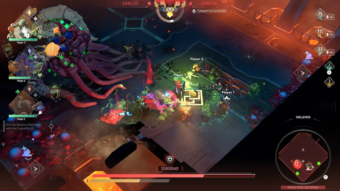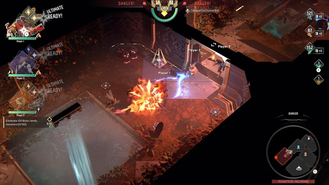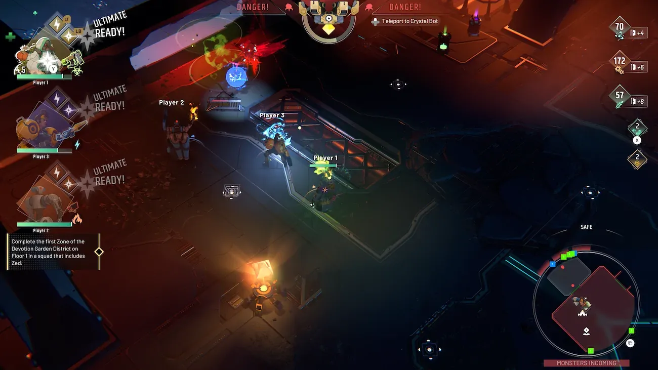 To win the game, you need to find the exit and tell your crystal sitting on top of a spider bot to come and unlock that exit, which will trigger endless waves of enemies. Either your bot gets to the last door and opens it, which takes time, or the enemy waves overwhelm you by destroying the spider-bot thing or killing all your characters.