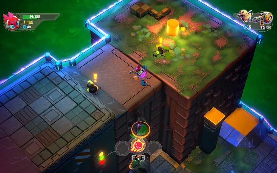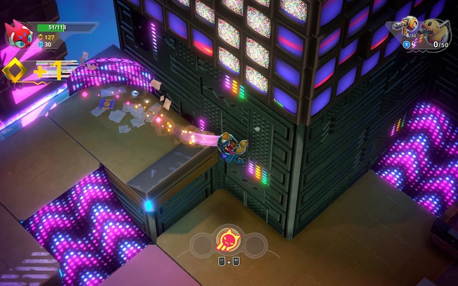 Because rolling around the levels here as the (almost Samus-like) mech feels so darn good, I found myself wanting more of it. Instead, the core gameplay has something of a stop/start rhythm, where you roll to some enemies, pop out of your ball form, and get to work dispatching baddies with your guns. Make no mistake, the twin-stick on foot moments are solid — wiping out a bunch of baddies, and picking up your loot is always fun here — and these twin-stick sections particularly shine during boss battles. Ultimately though, I found myself wanting more pinball opportunities — chances to just sling myself around the environments, gain momentum, and take out enemies as I went, in an almost combo-like fashion maybe. On the whole, the level design feels like it could have lent itself better to these pinball moments, as this is where things truly feel at their best.