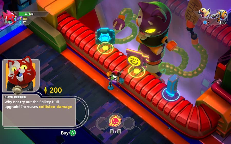 Once you complete a level, you go down a wormhole onto the next, and it is here where the roguelike progression comes in — you get a few options between levels on what you want to improve (abilities, upgrades, etc). You'll visit a shop to buy additional upgrades in between worlds. (The shopkeeper is an adorable huge cat, that will always go down well, so bonus points here.)