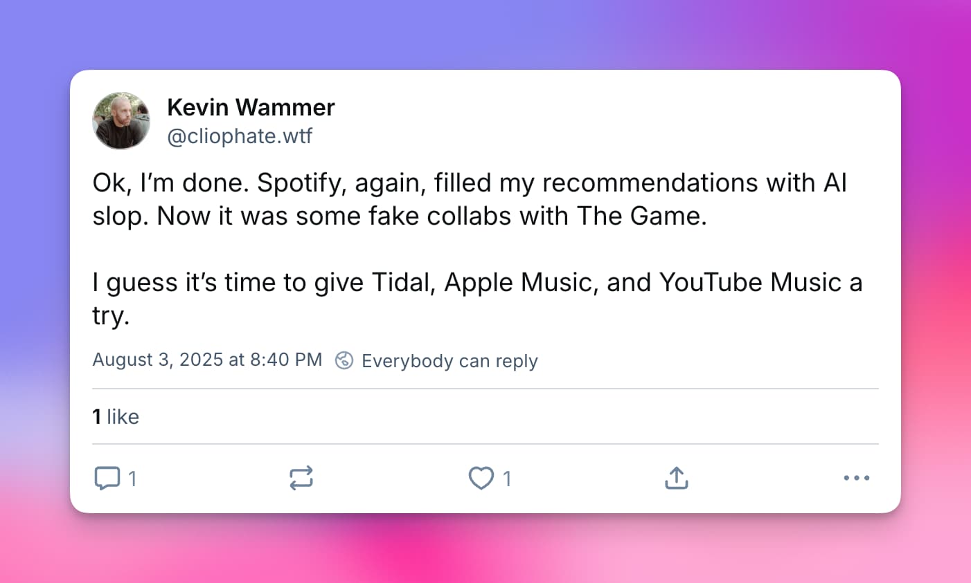 For months now, Spotify has been adding AI-created music to my different playlists, like Release Radar or Discover Weekly. Often, it's some random small musician using an AI version of a big rapper to somehow push their BS to playlists. It doesn't matter how often I keep downvoting the music or the artist, one week later, the same artist reappears in my playlist.