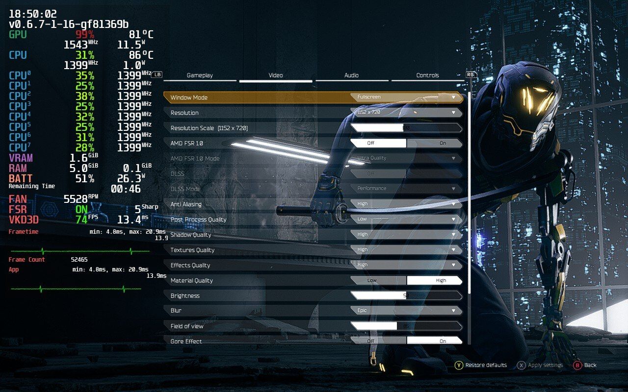 - If FSR is enabled (more below) and what sharpness level is set (for this example, set to 5)