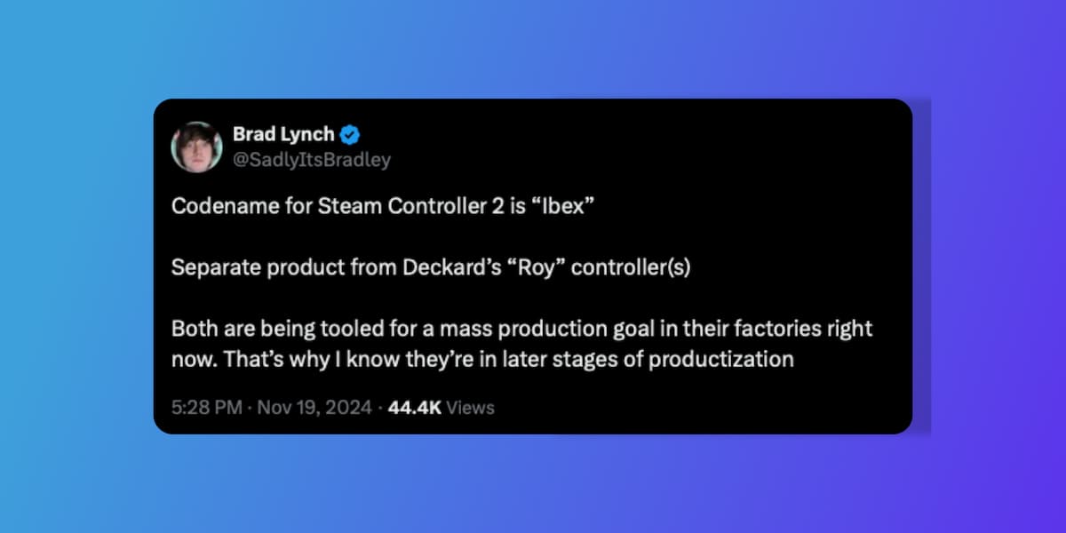 Brad Lynch, a keen follower of all things Valve and Steam, shared an update on X (Twitter) detailing that a new controller is currently "being tooled" for mass production, and goes on to note that this Steam Controller 2 goes by the codename 'Ibex' — which is a wild mountain goat, maybe this controller will be the goat?