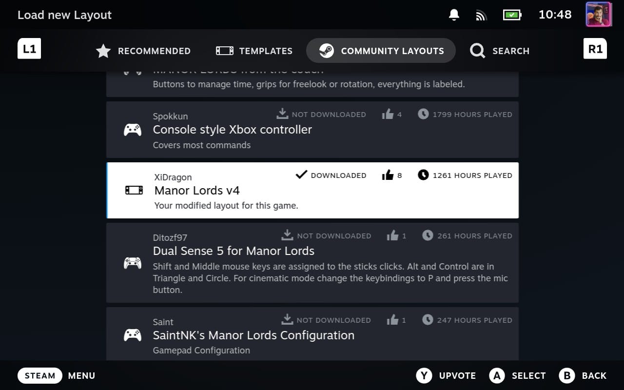 After being applied, this layout lets you use all of the Steam Deck's input capabilities: the right trackpad as a mouse, both joysticks as fine-tuned camera controls (height, rotation, etc.), and all other buttons (both front and rear) for the most used functions in Manor Lords. The creative community is definitely one of the biggest reasons to love what Valve is building with the platform.