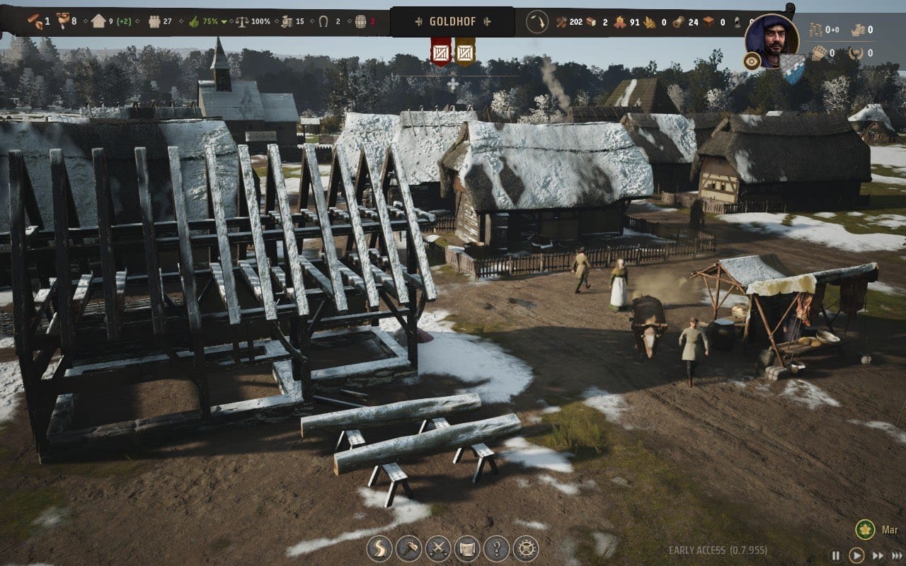 While all of these elements are subject to the View Distance setting, the performance impact, luckily, remains manageable. At 800p, 'Medium' still seems perfectly fine, as the added objects and detail over distance barely impact Manor Lords' image quality throughout gameplay.