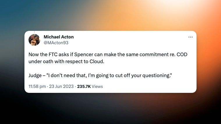 The trial continued with a few more minor revelations, like Pete Hines dunking on RedFall, and his initial refusal to release games on Nvidia's GeForce Now streaming service (they have a deal in place now). Sarah Bond argued that cloud streaming is, for now only a feature, while the FTC sees it as a completely different market (I agree with Bond here).