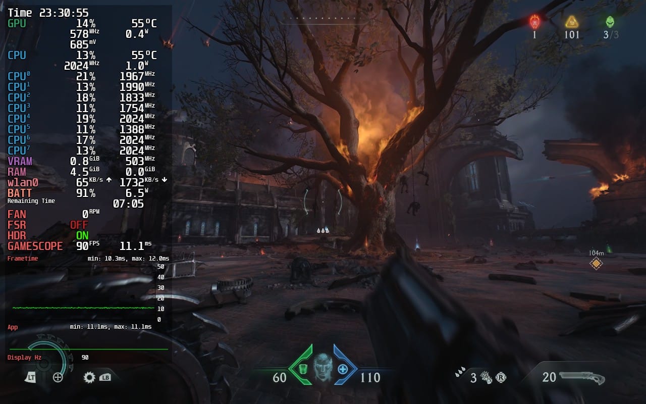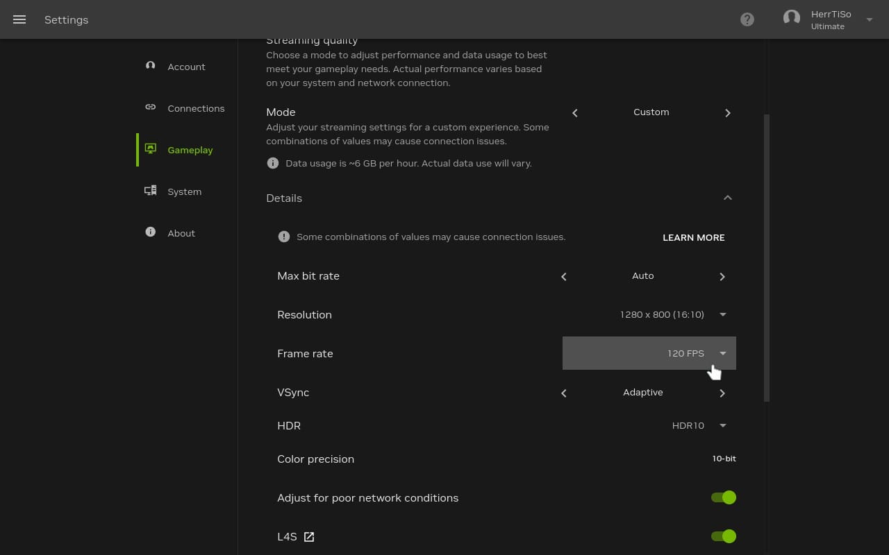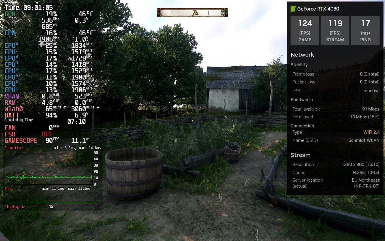 I never expected GFN’s 120 FPS streaming to work natively on the Deck, since the OLED screen is capped at 90 Hz. Even when docked to a large 4K display, you’d run into limitations due to the lack of HDMI 2.1 and support for high refresh rates at full resolutions, not to mention the absence of Variable Refresh Rate (VRR). That’s why I was so surprised over the last few weeks to discover that you can use GFN’s “Adaptive Sync” to enjoy games capped at 90 FPS on the OLED’s native 90 Hz screen.