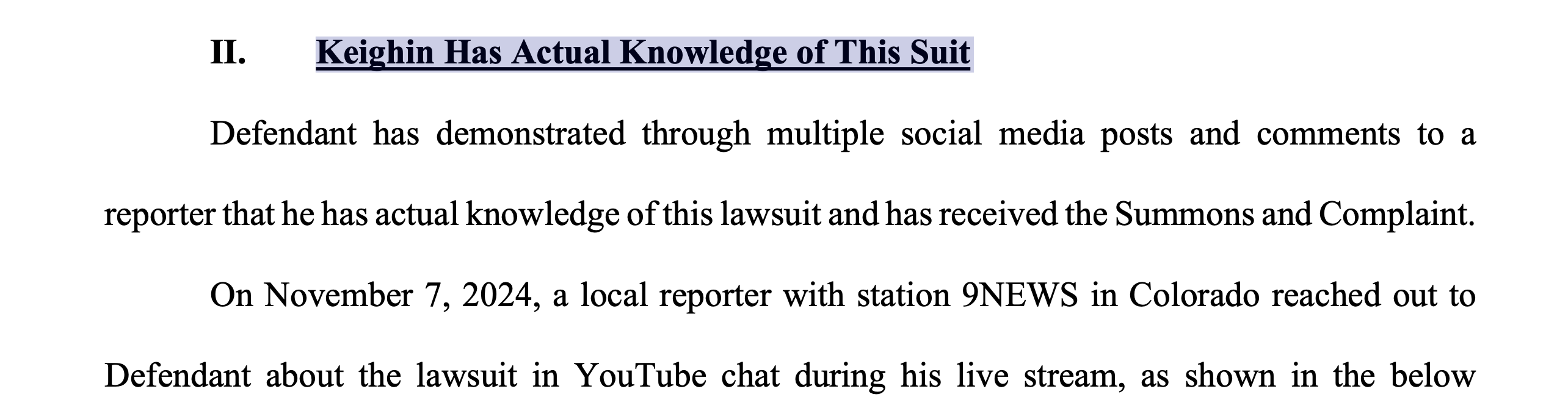 Keighin has confirmed publicly that he is aware of this lawsuit, even going so far as talking with a local news reporter from 9NEWS in his hometown. Following the subsequent publication of this 9NEWS report, it's noted that Keighin did then start to delete "a substantial amount of his online posts relevant to this suit".