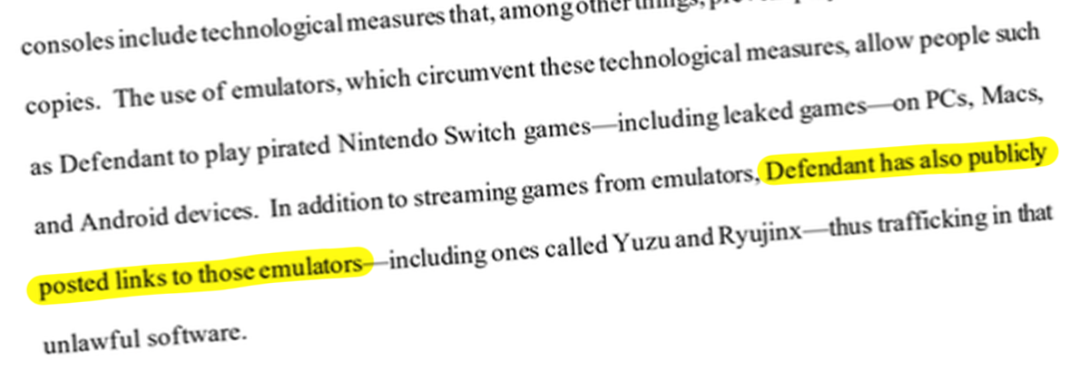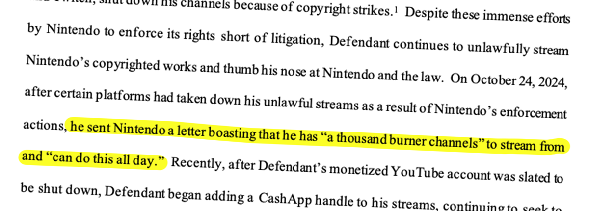 This lawsuit notes that, starting in 2022 Keighin streamed "unauthorised gameplay of at least ten of Nintendo's leaked games before their publication". Nintendo go on to explain in the filing how they would then issue takedown notices to stop these streams, but defendant Keighin would just make another 'burner channel' account in order to continue.