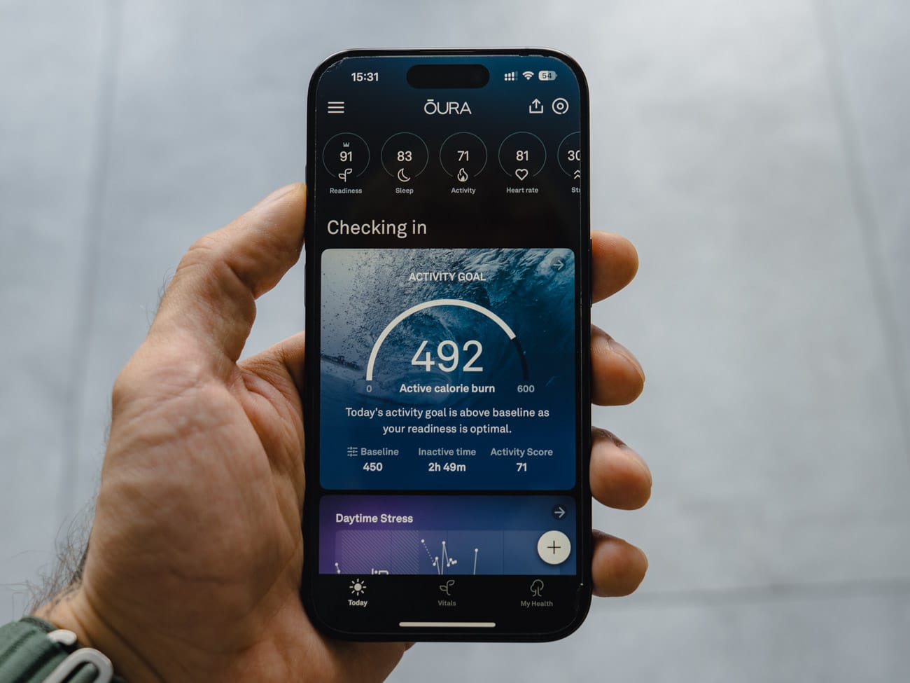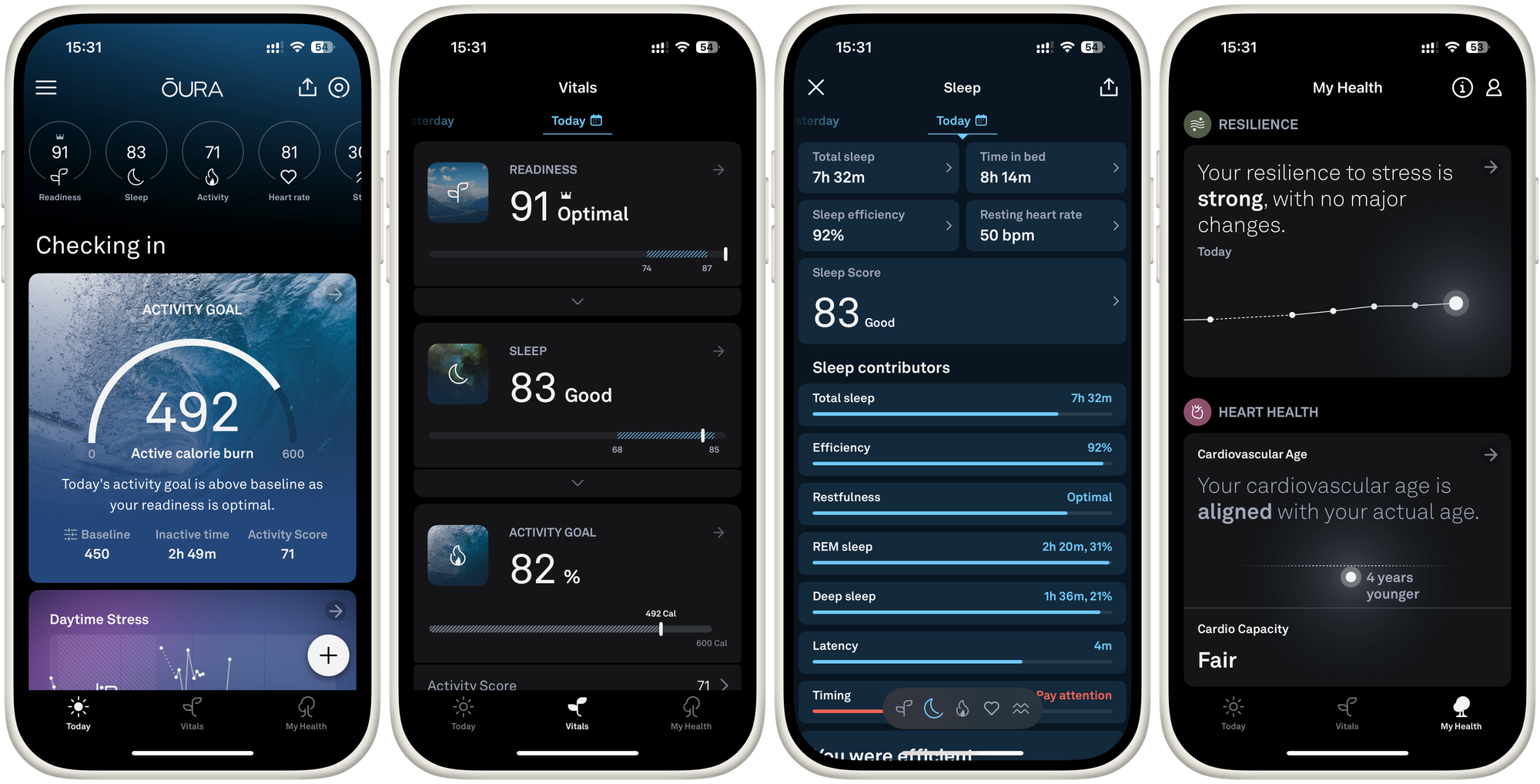 Oura’s redesigned app dashboard actually helps now. It’s organised into three sections — Today, Vitals, and My Health — and it doesn’t feel like drowning anymore.