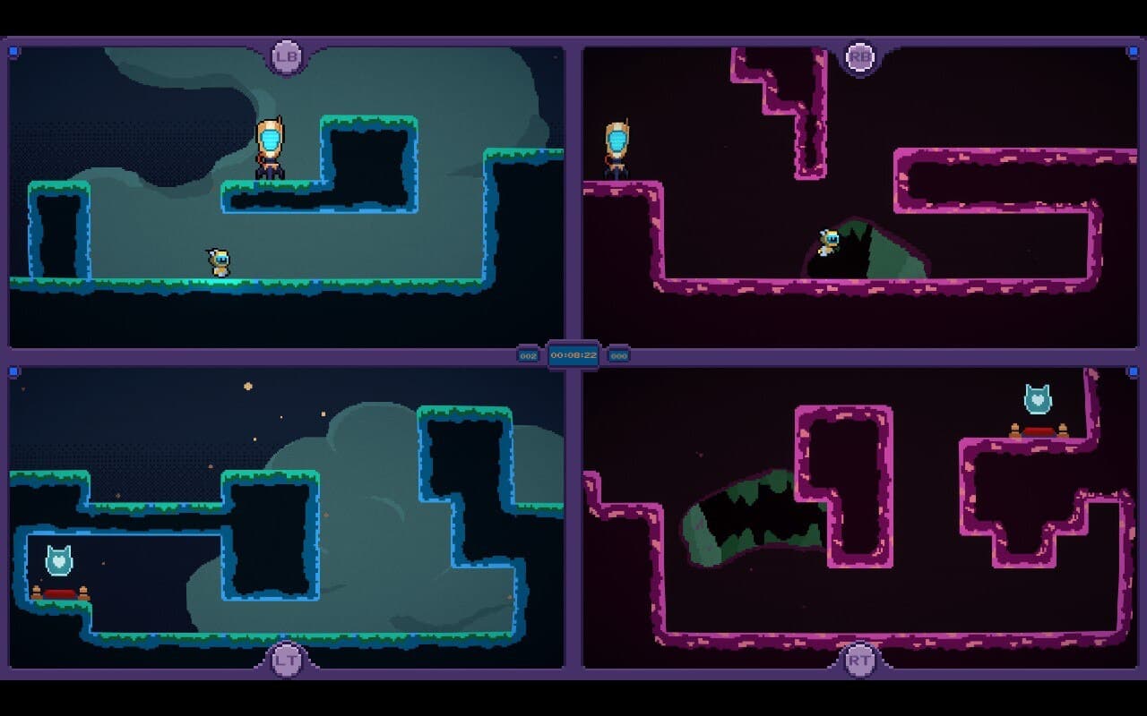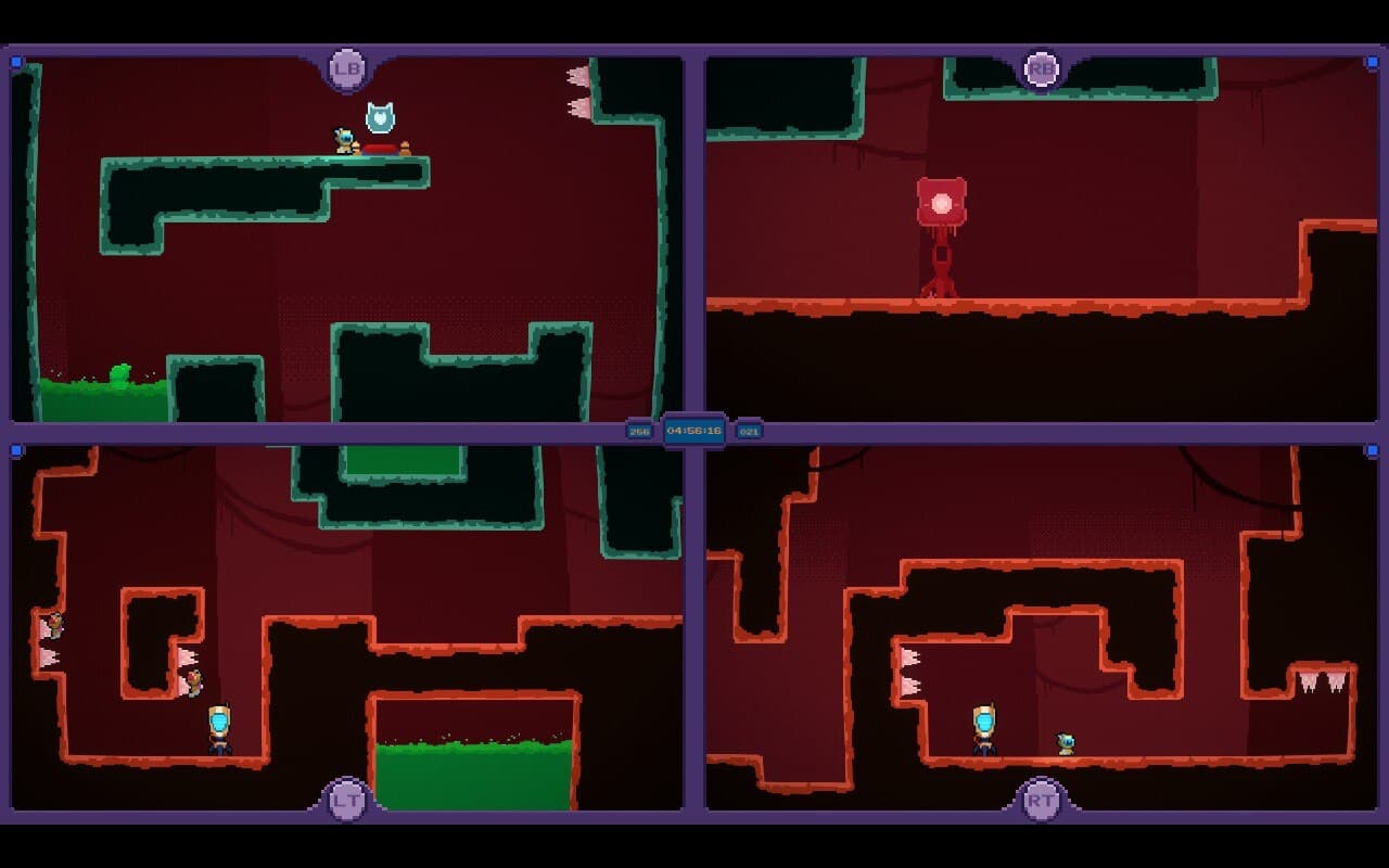 The action in this precision platformer takes place across four split screens — and it appears on the surface to be a four-player experience — but no, you, as a single player, are put in control of all four screens at once.
