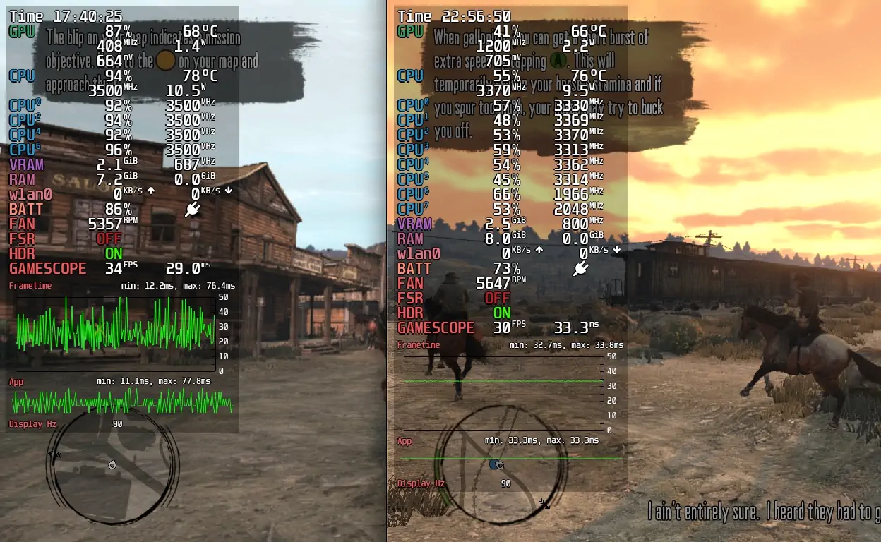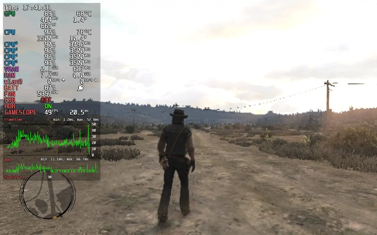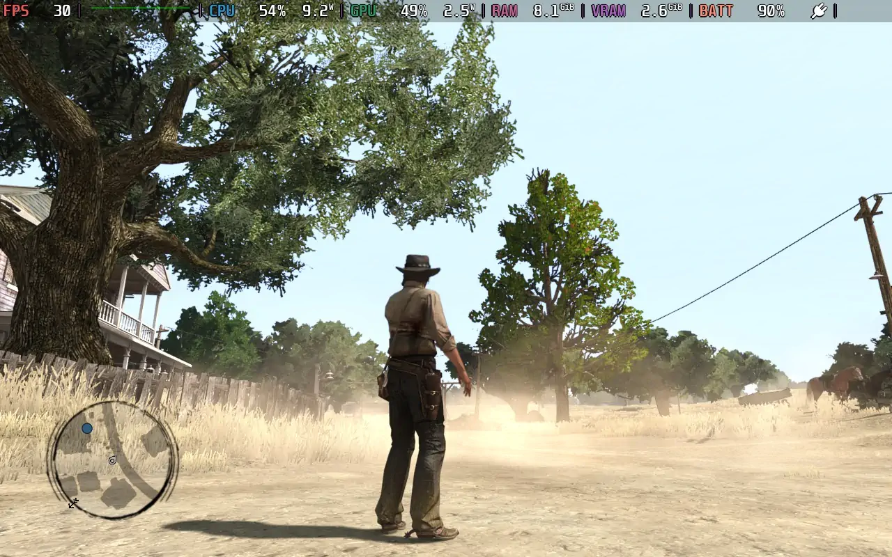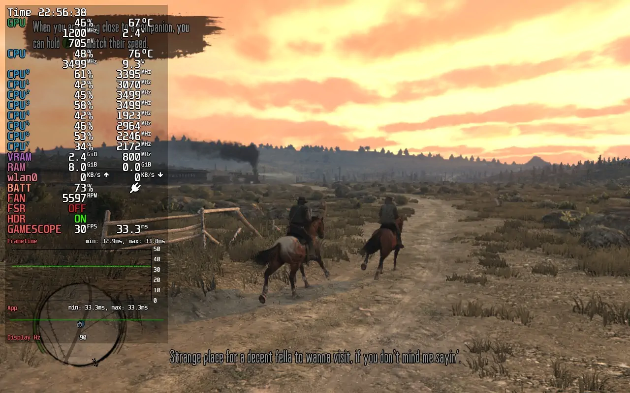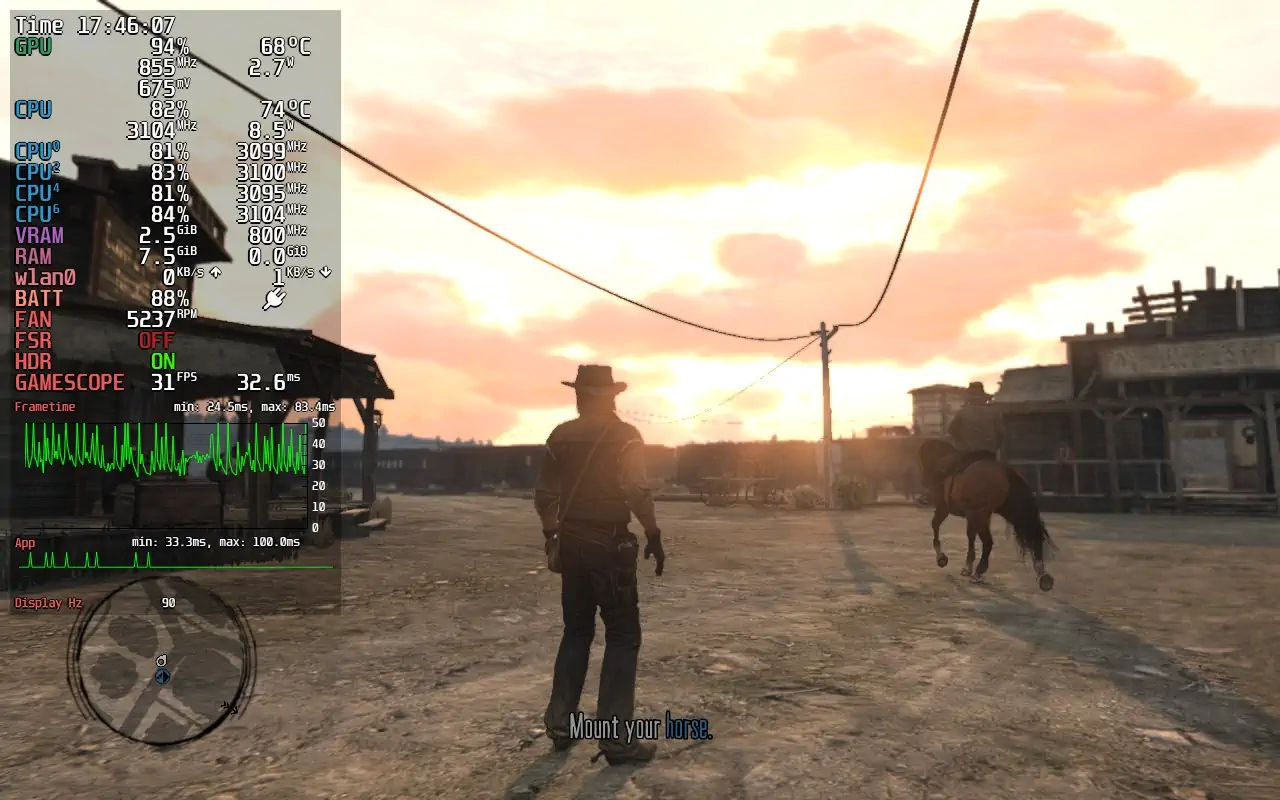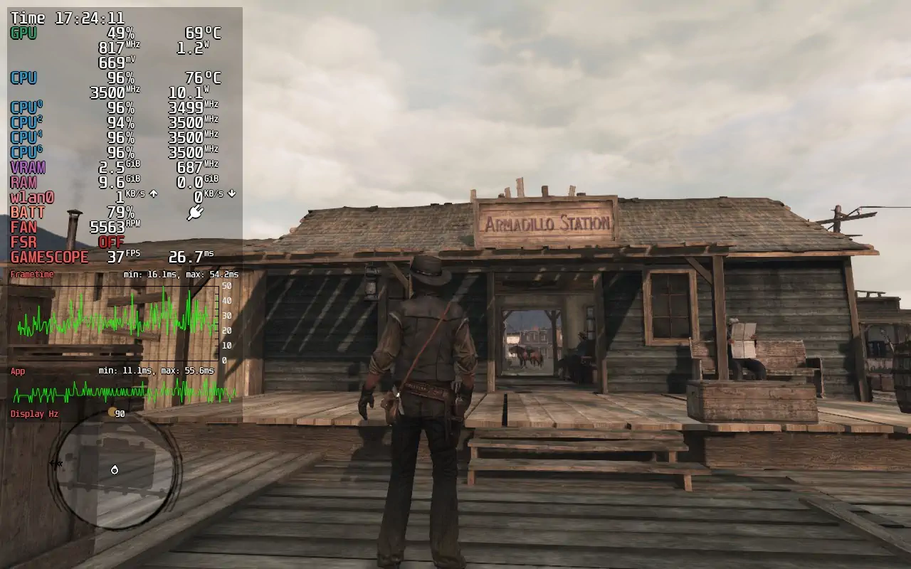Once Marston arrives at the train station after the intro sequence and we get to control him, one thing becomes clear: The performance of RDR on Steam Deck is surprisingly good. After an initial sub-10 fps hiccup, the Ultra settings land at around 25-35 fps, and even more if you turn the camera away from the bustling town of Armadillo.