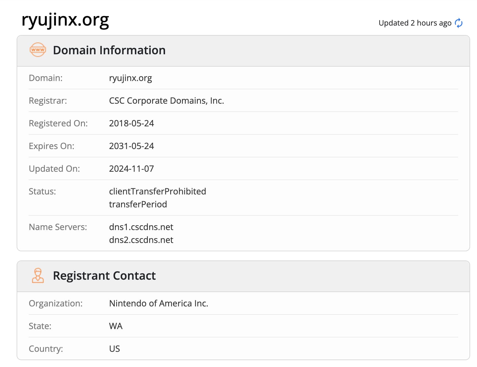 A check on who.is, a tool to verify who owns a domain clearly shows, that Nintendo of America is now the sole owner of the ryujinx.org domain.