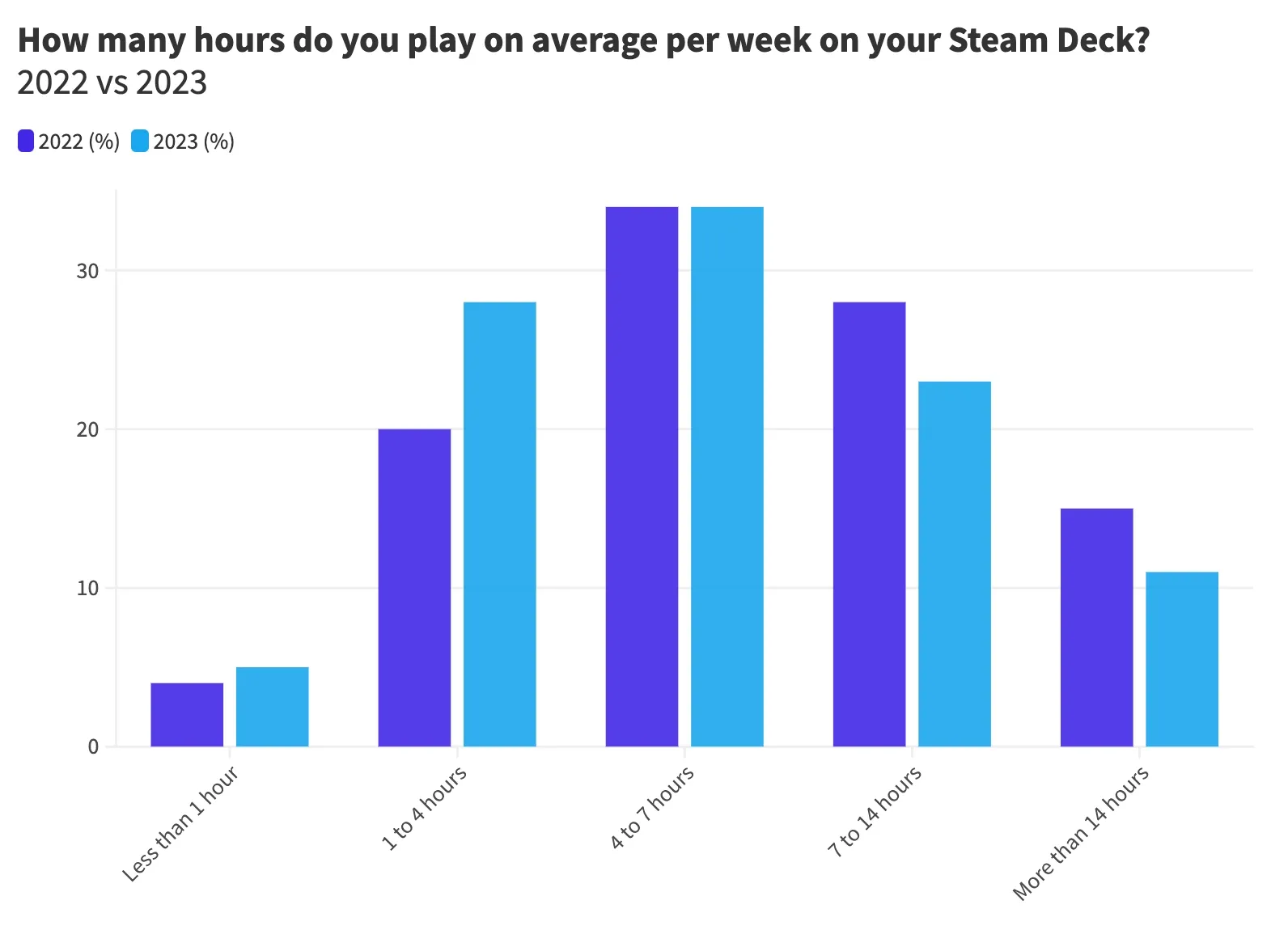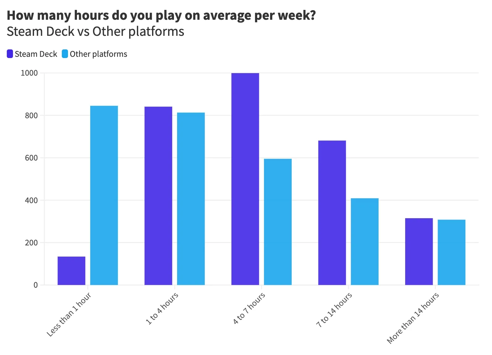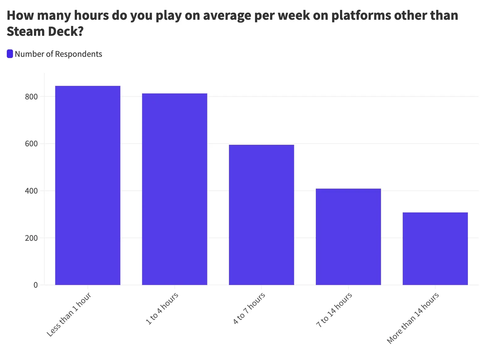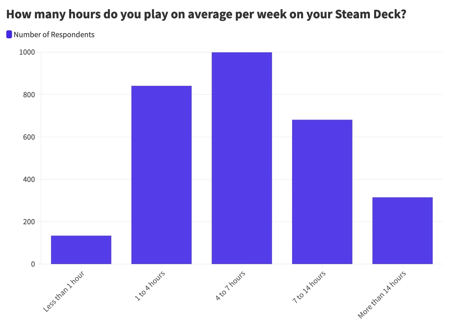 Next, we wanted to know how much time people typically spend playing their Steam Deck each week. People generally game around 1 to 7 hours weekly on their Steam Deck. Approximately 60% of users reported so: