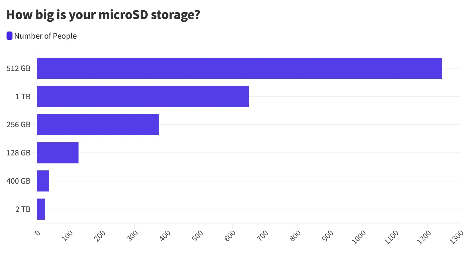 But people didn't necessarily stick with the included storage. 1000 people out of all the participants upgraded their internal storage, with the most popular option being a 1TB SSD. Most people, in fact, updated from their initial 64GB to 1TB. Here is a complete chart: