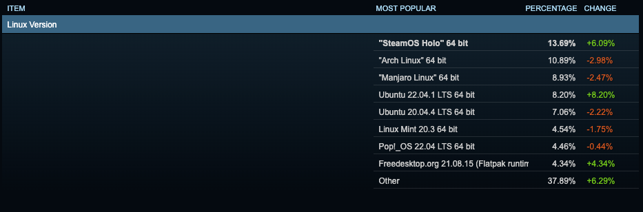 The numbers are in and now it's official: SteamOS is technically the most popular version of Linux on Steam. I say "technically" because, looking at the ranking below, you see that adding both Ubuntu flavours together would still be more popular.