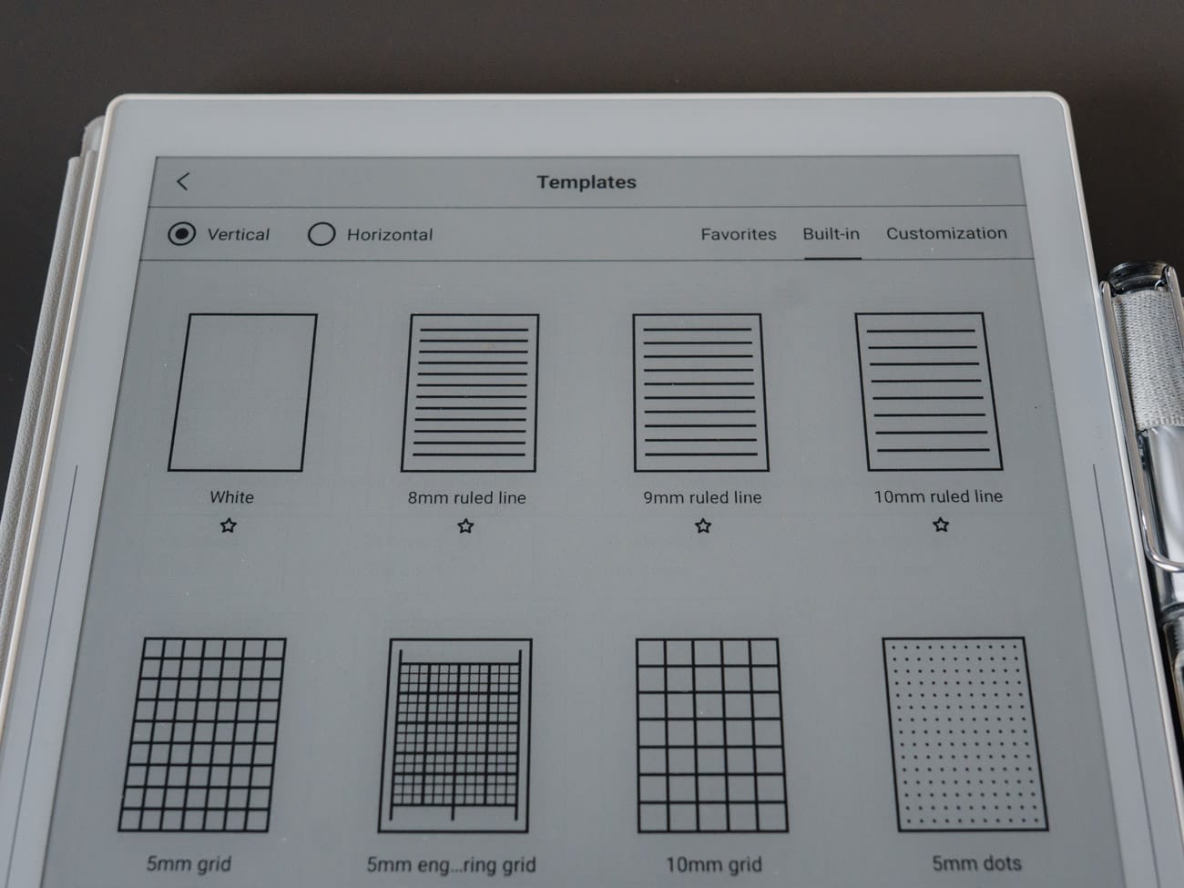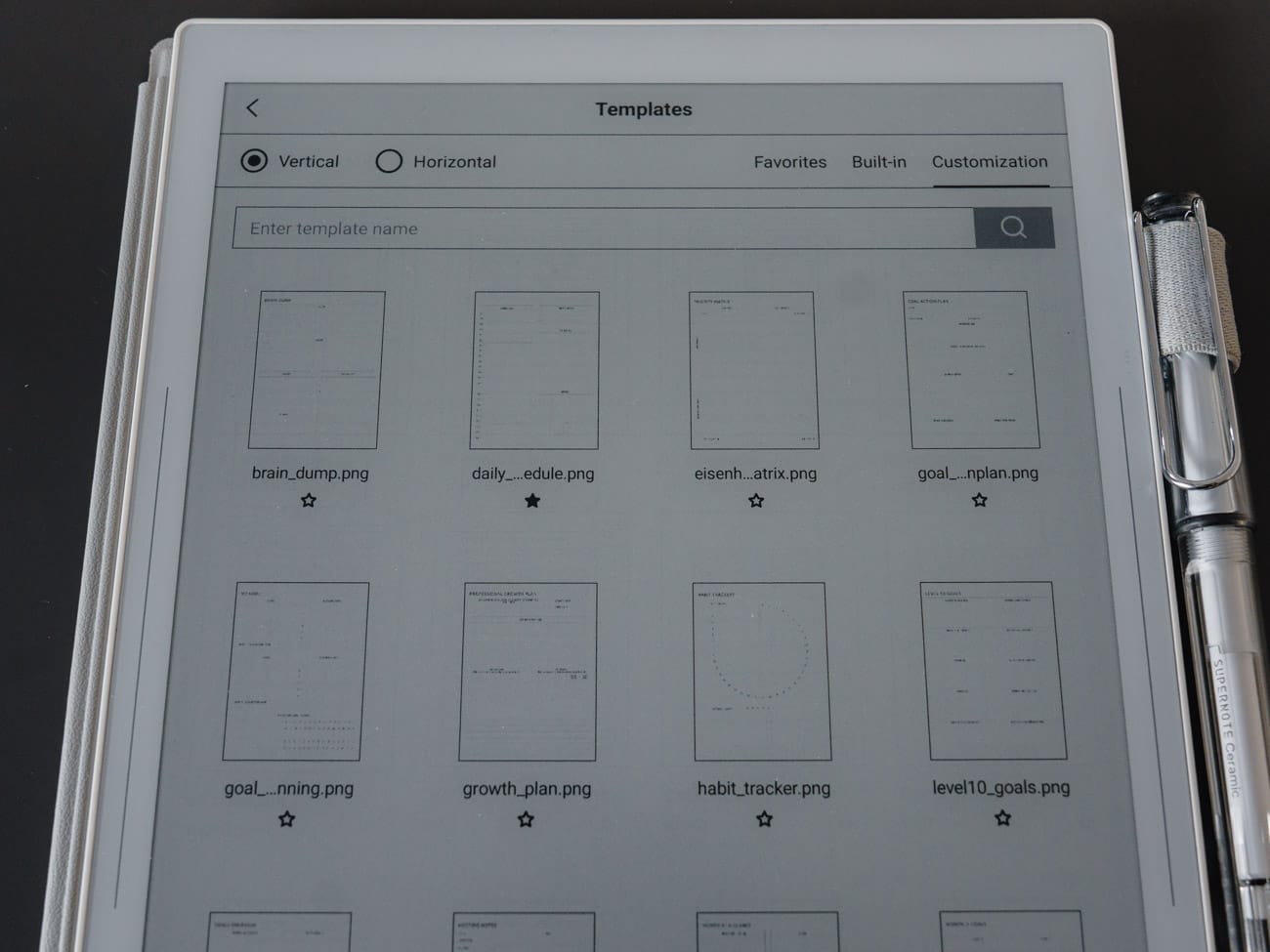 There are dozens of built-in templates on this thing — dotted, ruled, lined, Cornell, daily agendas, etc., plus the option to upload your own (it just takes PNG files for templates, or PDF files for more sophisticated planners). I ended up using two versions of this Latex planner 90% of the time. The default one for work, and a version I edited for personal journaling.