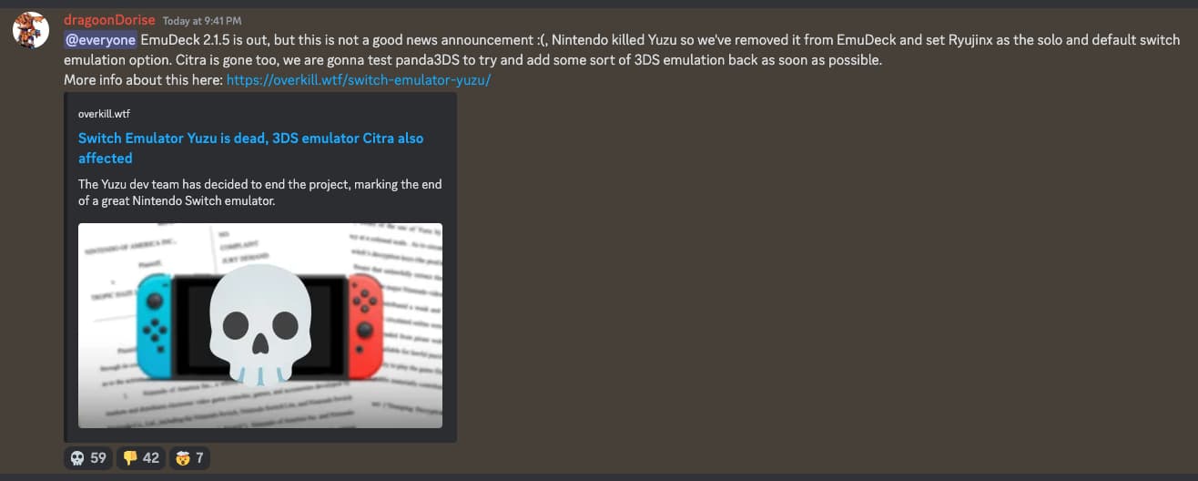 It is also unclear if, following this action, other companies will now go against more emulators upon seeing Nintendo's success – and if, thus, emulation will turn into an even more niche thing. The first consequences I saw were the Steam Deck Discord, disallowing any talk about emulation, and EmuDeck completely removing any mentions of Yuzu from the tool.