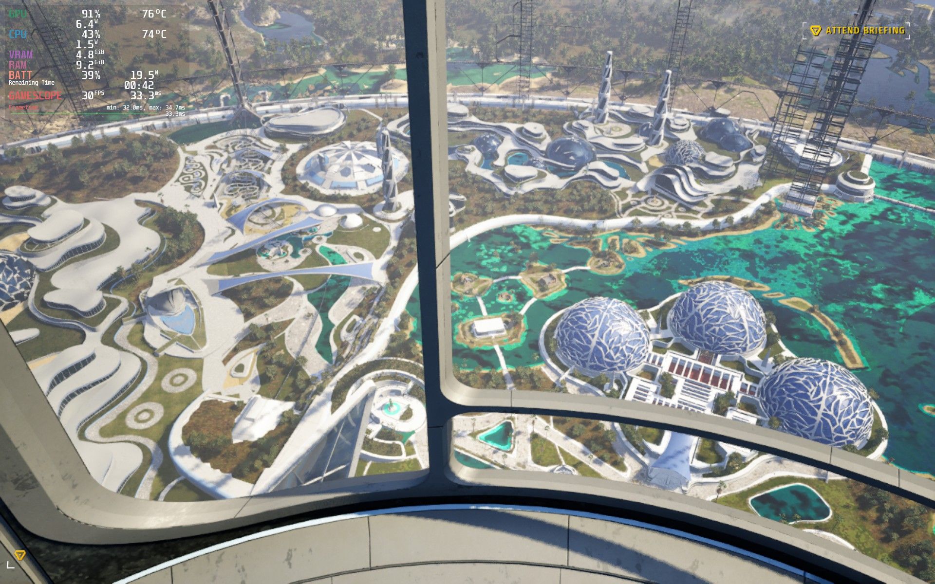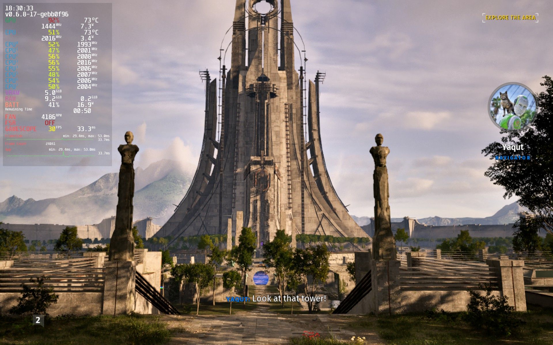Once our protagonist named 1K (named so because we're the 1000th sentient robot awakened from a form of hive sleep) completes the tutorial and finds himself in the starting area — the city of New Jerusalem, things look quite different. You’ll see a significant increase in detail and prop density, presenting a considerable challenge to the Steam Deck’s APU, resulting in substantial frame pacing issues.