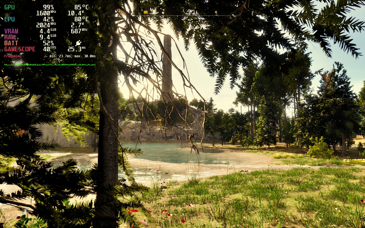In my experience, situations where all effects are in play simultaneously present quite a challenge for a power-restricted handheld. I’ve chosen a specific spot where we have exactly that on the screen: Dense foliage casting granular shadows, distant meshes, a lake with reflections, and light filtering through tree branches, showcasing the effects of Global Illumination, and more. With all settings (except Textures) set to low and an unlocked frame rate, we’re nearing the Golden 40 Area.